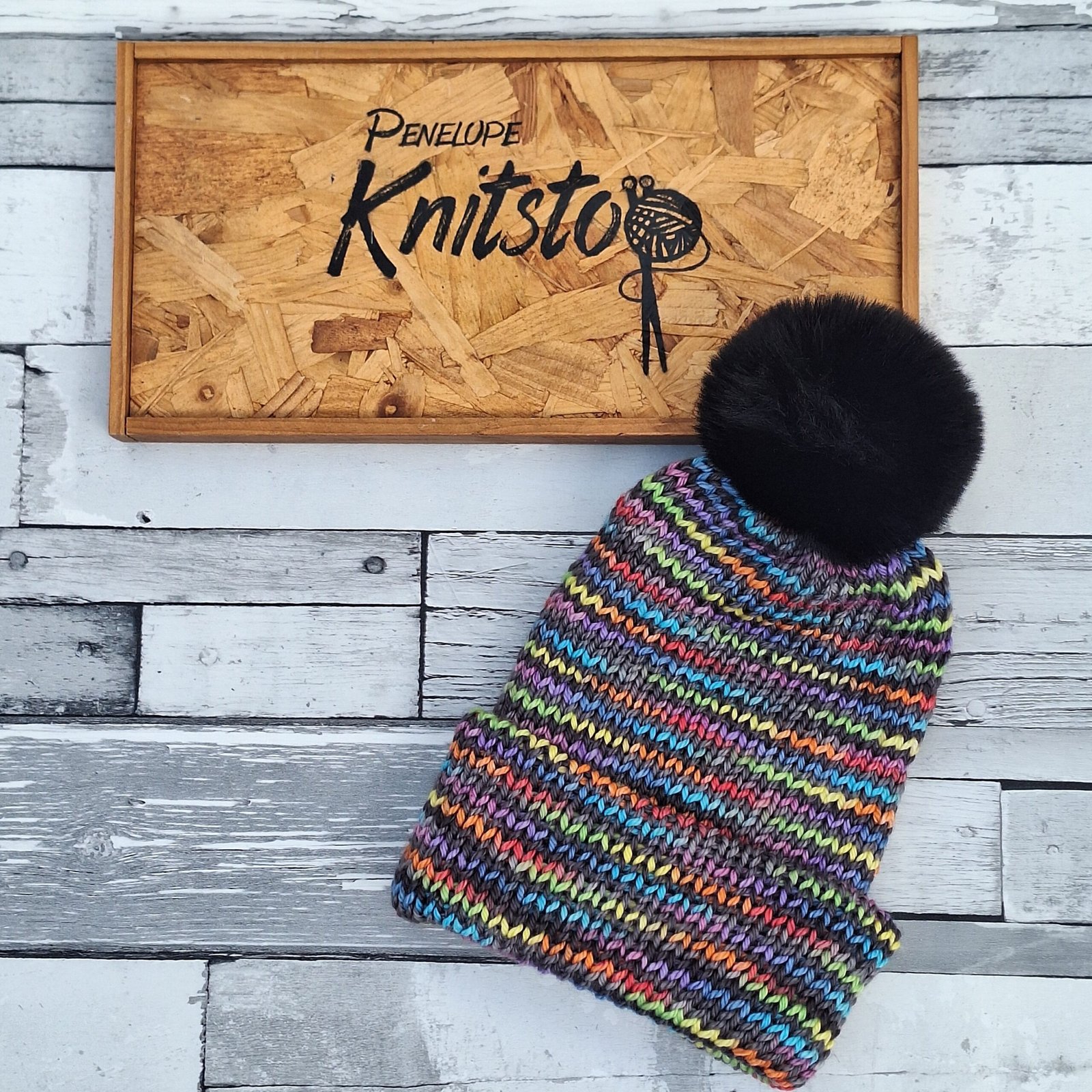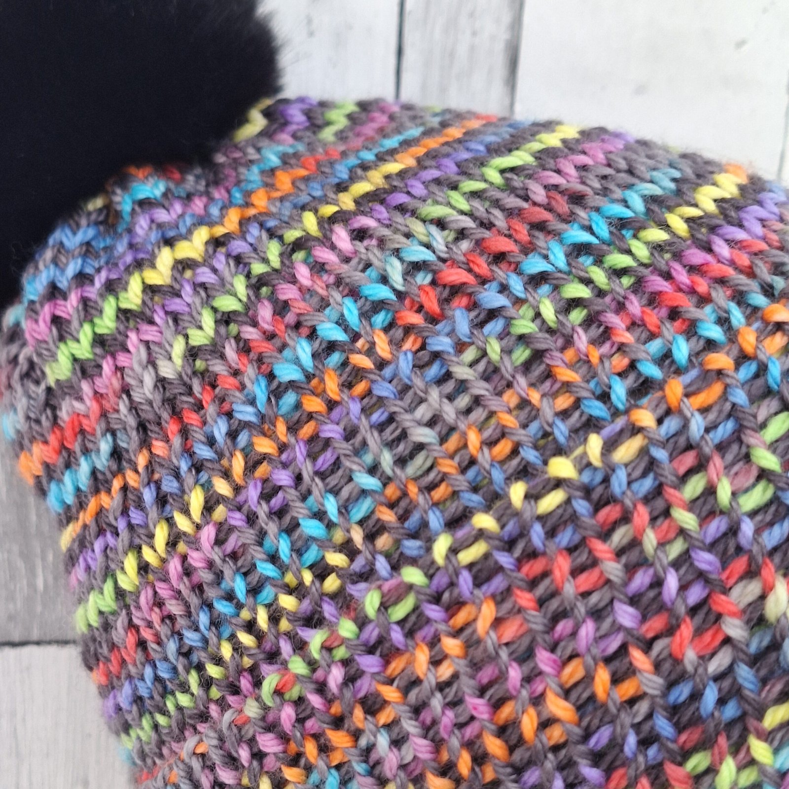 On a 100% merino superwash base, so soft, stretchy, warm and so, so comfortable to wear, and perfectly topped with an optional fluffy faux fur jet black pom poms.