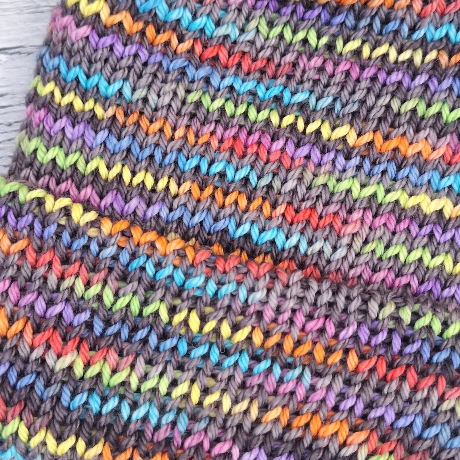 A one-off for me featuring a unique hand-dyed multi-coloured skein. Not dyed by me this time, but from the amazing TwinklyKnits. Bright splashes of colour cooled down by darkest grey.