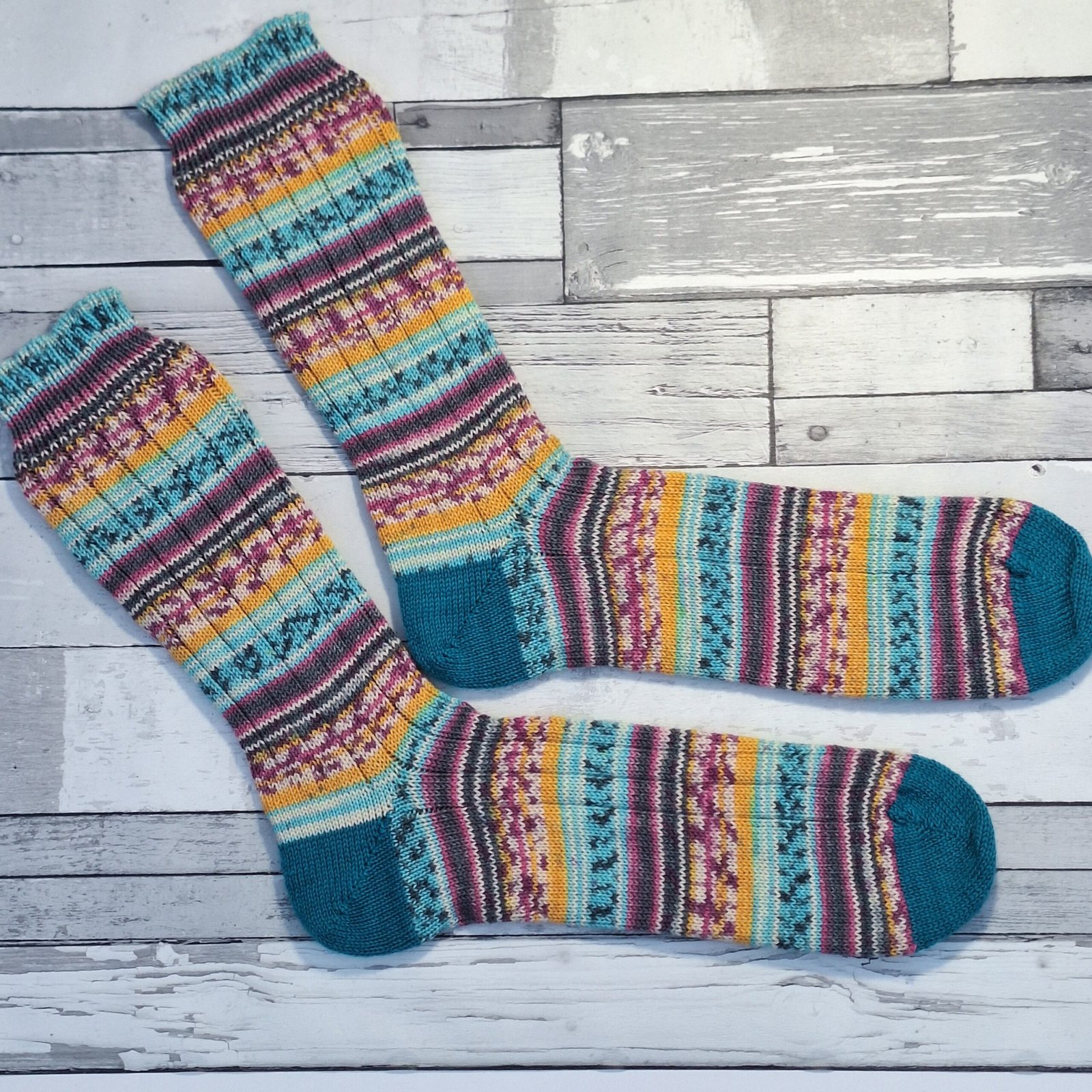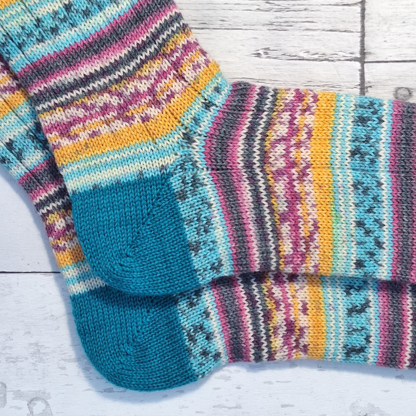 HANDMADE KNITTED SOCKS – Size 15 – Funky with turquoise heels and toes