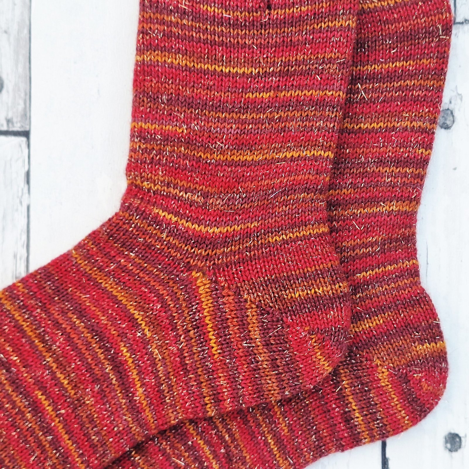 These are right up my street. I always used good quality 75% Superwash wool/25% nylon blend, which means they are practical and hard wearing and will last and last, and these are just a little cut above the average, knitted in the fantastic Signature 4-ply from West Yorkshire Spinners. British grown and British milled featuring a luxury 35% Blue Faced Leicester. You’ve heard of merino wool I’m sure. Supersoft and practically guaranteed not to cause any irritation to the skin. So meet it’s British grown cousin. Blue Faced Leicester is so soft and fluffy, but unlike merino, is much more hard-wearing. Once you’ve tried knitted socks you’ll never want to wear anything else, especially in this quality wool. So comfortable, so warm, so long lasting. And this colourway is amazing. You can almost smell those Christmassy scents, with a little sparkle too.